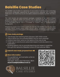 The Balsillie Case Studies is a repository of true stories of contemporary technology governance challenges experienced by governmental, industrial and multilateral institutions. The dilemmas require innovative solutions to break away from the status quo. Prepared by experts from within a particular domain, the Balsillie Case Studies series nurtures critical thinking about safety, human rights, transparency, accountability and other governance innovation to the implementation of emerging technologies.The Balsillie School of International Affairs (BSIA) is accepting applications to the Balsillie Scholars program. For more information, visit https://balsillieschool.ca/balsillie-scholars/.