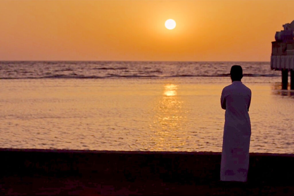 Silhouette of a man standing on a beach looking at the water and the sun setting in the sky.