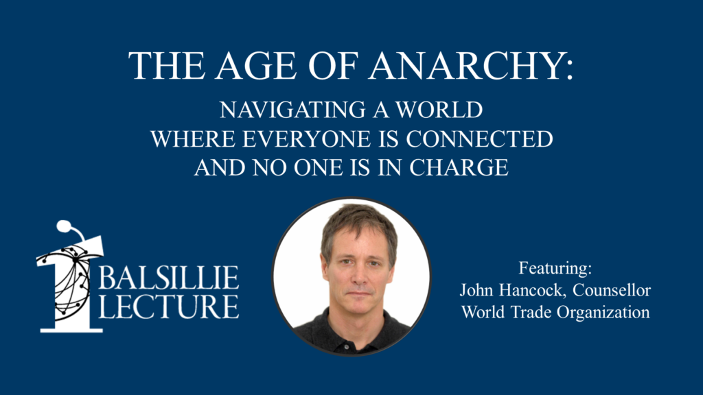 Title of the event, Balsillie Lecture logo which includes a podium with the BSIA logo on it, a photo of John Hancock, on a blue background