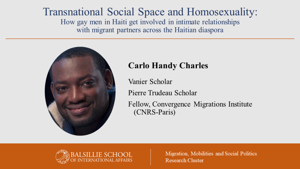 Carlo Handy Charles is a dual Ph.D. Candidate in Sociology at McMaster University and Geography at the CNRS-LC2S, Université des Antilles. His dissertation examines how gay men in Haiti navigate transnational romantic and intimate relationships with their migrant partners across the Haitian diaspora in the United States, Canada, France, Dominican Republic, and Brazil. He has won over 20 awards for his research and leadership, including the SSHRC-Vanier Canada Graduate Scholarship, the Pierre Elliott Trudeau Scholarship, and a Pre-Doctoral Fellowship at Convergence Migrations Institute (CNRS-Collège de France, Paris). He is a Sessional Faculty in Sociology at McMaster. He is also a former Public Policy Advisor to the City of Toronto, a playwright, and a policy columnist. His work has appeared in several academic journals and mainstream media in Canada and internationally.