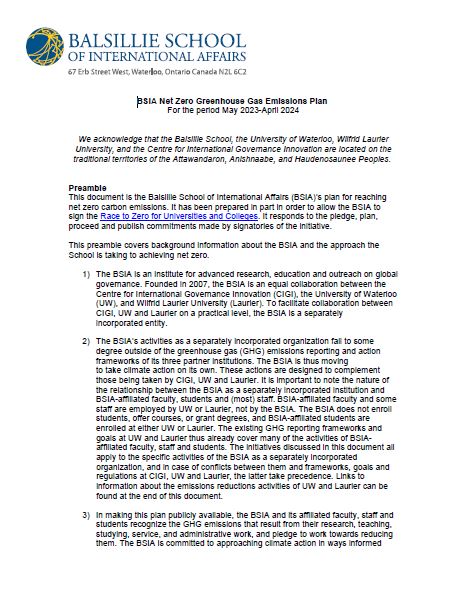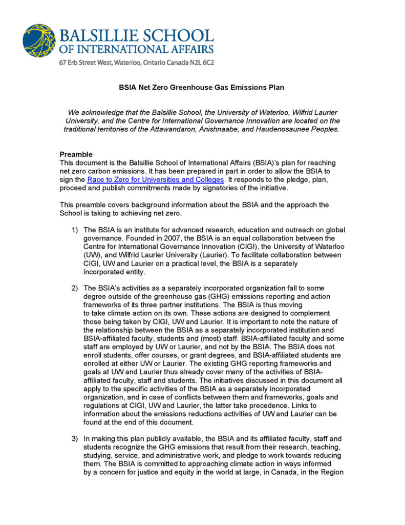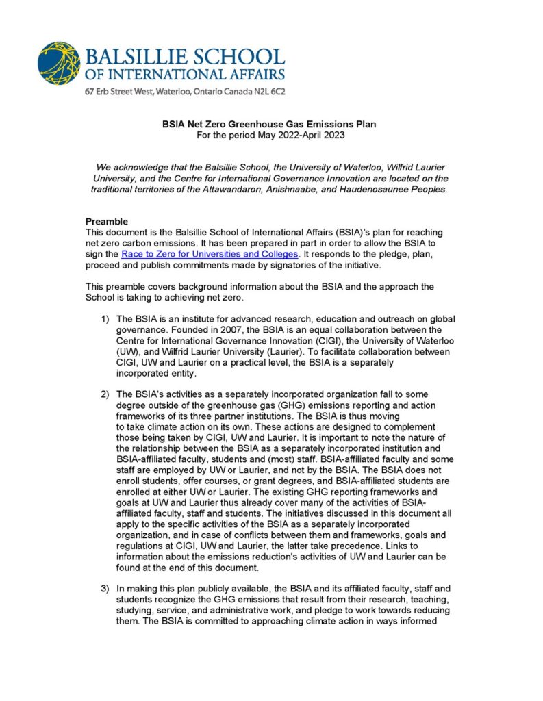 In 2021, the Balsillie School published its Net Zero Plan, joined the Race to Zero, and became a member of Sustainable Waterloo Region. The BSIA has committed to reporting its annual greenhouse gas emissions, to reducing building-related emissions by 10% and travel-related emissions by 30% by 2026, and to reaching net zero emissions by 2040. Our climate action and sustainability work is coordinated by the Global Climate Action Committee, which was founded in 2020.